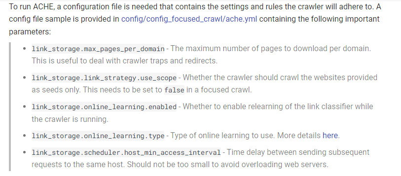 ACHE is a focused web crawler. It collects web pages that satisfy some specific criteria, e.g., pages that belong to a given domain or that contain a user-specified pattern. ACHE differs from generic crawlers in sense that it uses page classifiers to distinguish between relevant and irrelevant pages in a given domain. A page classifier can be defined as a simple regular expression (e.g., that matches every page that contains a specific word) or a machine-learning-based classification model. ACHE also automatically learns how to prioritize links in order to efficiently locate relevant content while avoiding the retrieval of irrelevant pages. While ACHE was originally designed to perform focused crawls, it also supports other crawling tasks, including crawling all pages in a given web site and crawling Dark Web sites (using the TOR protocol).