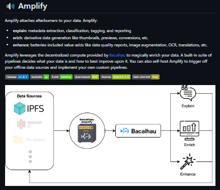 Amplify attaches afterburners to your data. Amplify explains metadata extraction, classification, tagging, and reporting. Eriches derivative data generation like thumbnails, previews, conversions, etc. Enhances batteries-included value-adds like data quality reports, image augmentation, OCR, translations, etc. Amplify leverages the decentralized compute provided by Bacalhau to magically enrich your data. A built-in suite of pipelines decides what your data is and how to best improve upon it. You can also self-host Amplify to trigger off your offline data sources and implement your own custom pipelines.