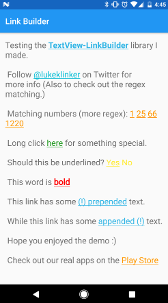 Insanely easy way to create clickable links within a TextView. While creating Talon for Twitter, one of the most difficult things I encountered was creating these clickable links based on a specific text. Luckily, I have made it easy for anyone to apply this type of style to their TextView's. Similar to how all the big players do it (Google+, Twitter, cough Talon cough), this library allows you to create clickable links for any combination of Strings within a TextView.