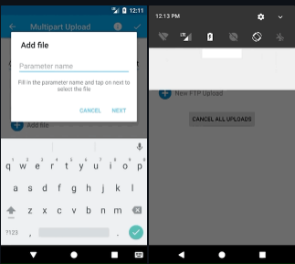 Easily upload files (Multipart/Binary/FTP out of the box) in the background with progress notification. Support for persistent upload requests, customizations and custom plugins. At the core of the library, there is a Service that handles multiple concurrent upload tasks in the background. It publishes broadcast intents to notify status. This way the logic is completely decoupled from the UI. You are safe launching upload requests from your fragments, activities and services without worrying about locking the thread in which you are. Check the wiki to learn how you can use it in your App. You are also safe if your app is put in the background. All the uploads will continue to be executed also when your device is idle. Bear in mind that if you kill your app, the service gets killed as well, as it's attached to your app's process and all the currently running uploads will be terminated abruptly.