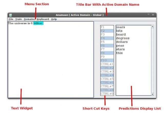 Anumaan is a predictive text entry system developed by CDAC, Mumbai, India. It gives context sensitive text prediction. Hence, it helps in effective text entry. It is intended for people suffering from different kinds of motor disabilities.