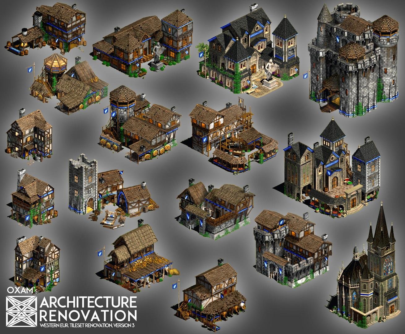 We've been playing this game for over 15 years, why not remix the visuals a bit? The intent is to create a fan based modification that illustrates a more pronounced progression from Feudal to Castle and subsequently Imperial Ages, after all we're talking multiple centuries here! With the larger resolution and population cap of the HD version of Age of Empires 2 it's time to increase the size of buildings and create dense urban environments at the latter stages of a match. It's also perfect for scenario makers that want to try out something different. Many thanks to Ensemble for creating this amazing game!! Still going strong!