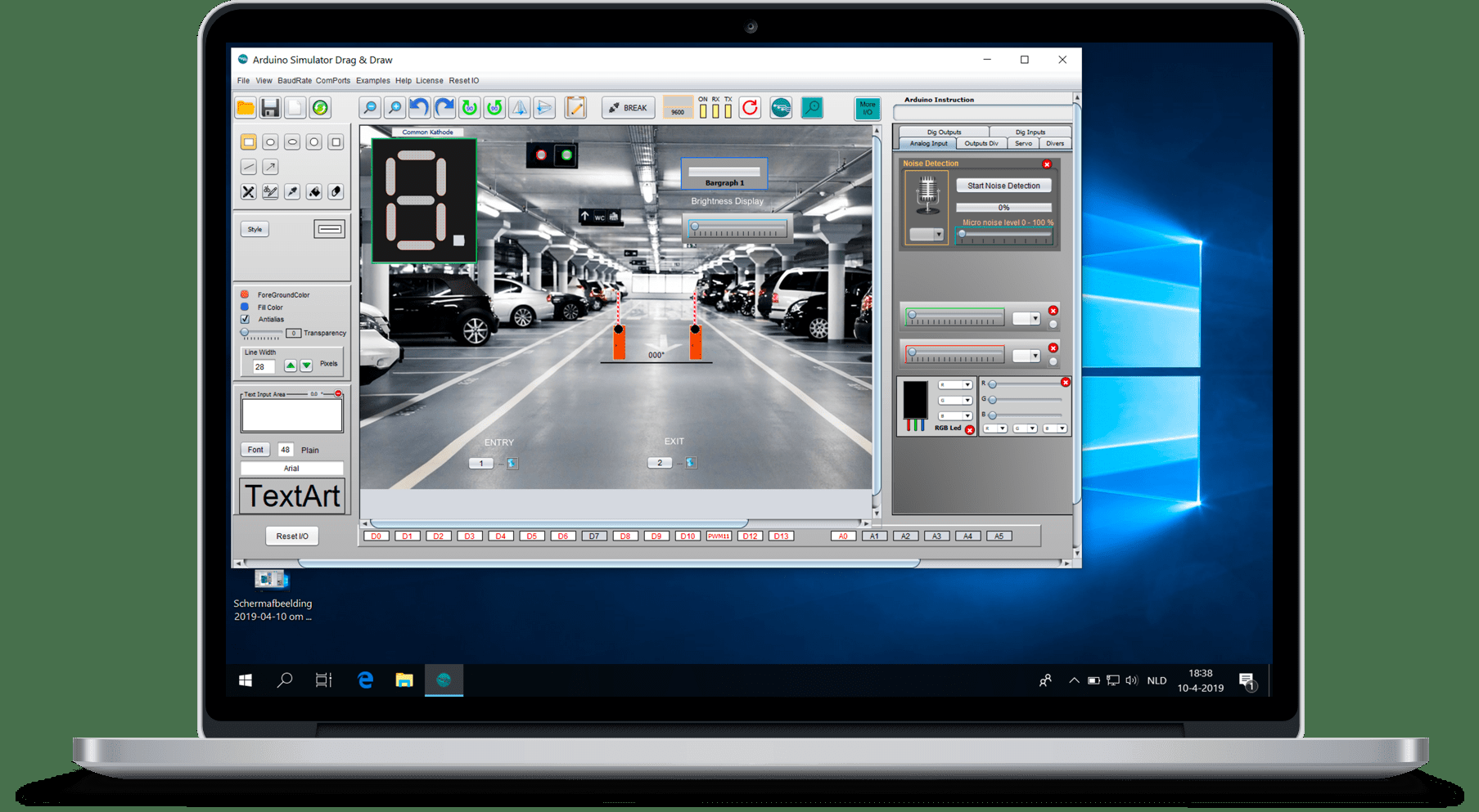 You can drag and drop the components in a worksheet and you can draw everything you want around it. It is also possible to load a background into the worksheet. You can also combine simulated inputs/outputs from the pc and real Arduino IO, now you have made a little HMI (Human Machine Interface).