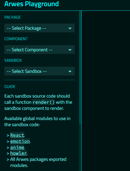 Arwes is a web framework to build user interfaces based on futuristic science fiction designs, animations, and sound effects. The concepts behind are opinionated with influences from Cyberprep and Synthwave, and productions like Star Citizen, Halo, and TRON: Legacy. It tries to inspire advanced space and alien technology. The playground application intends to show the project APIs in a live environment so the developer can test the main functionalities and components use cases in JavaScript (not available in TypeScript) for both development and production environments. Arwes UI applications are rich in visuals, animation, and sound effects, which can be structured as a tree of nodes. A node represents and interactive and stateful UI component with design, animations, and/or sound support. The nodes in a tree are interconnected with each other by inheriting data and communicating dynamically.