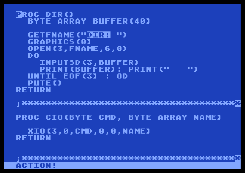 Action! is significant for its high performance, which allows games and graphics demos to be written in a high-level language without use of hand-written assembly language code. Action! language constructs were designed to map cleanly to 6502 opcodes.