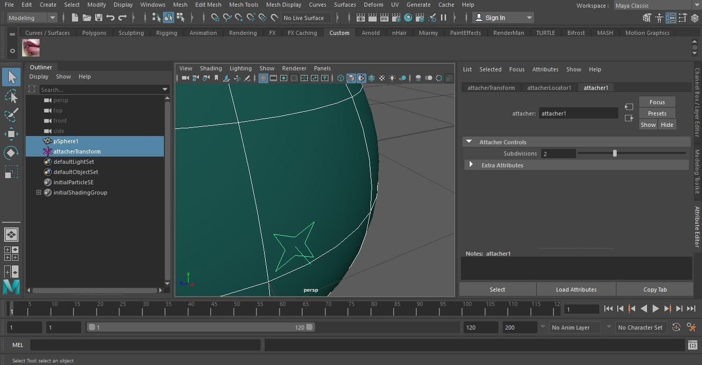 Maya attacher plugin, creates a locator that sticks to a polygon face. Locator can be moved to any location on the face by using tensions. These can be imagined like rubber strings connecting the locator to the corners of the face. Subdiv iterations can be set, resulting in the locator moving along a catmull clark subdivided representation of the face, without having to subdivide the mesh. Must be used on a triangle or quad mesh face.