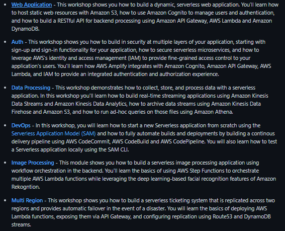 This repository contains a collection of workshops and other hands-on content that will guide you through building various serverless applications using AWS Lambda, Amazon API Gateway, Amazon DynamoDB, AWS Step Functions, Amazon Kinesis, and other services. This workshop shows you how to build a dynamic, serverless web application. You'll learn how to host static web resources with Amazon S3, how to use Amazon Cognito to manage users and authentication, and how to build a RESTful API for backend processing using Amazon API Gateway, AWS Lambda and Amazon DynamoDB. Shows you how to build in security at multiple layers of your application, starting with sign-up and sign-in functionality for your application, how to secure serverless microservices, and how to leverage AWS's identity and access management (IAM) to provide fine-grained access control to your application's users. You'll learn how AWS Amplify integrates with Amazon Cognito, Amazon API Gateway, AWS Lambda, and IAM.