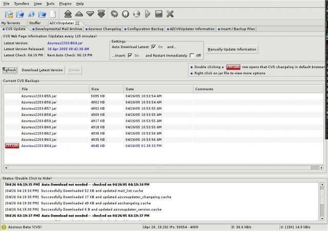 AZCVSUpdater is a plugin module for the java Bittorrent client, Azureus (http://azureus.sourceforge.net). This plugin helps manage Azureus beta releases by automating the process of checking for new builds, downloading them, installing them, and more!