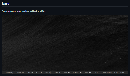 Baru gathers the information from /sys and /proc filesystems (filled by the kernel). Except for audio and network modules that use C libraries. There is no memory leak over time. All modules are threaded. Thanks to this design (as well as Rust and C), baru is lightweight and efficient. It can run at a high refresh rate with a minimal processor footprint. The audio module communicates with the PipeWire/PulseAudio server through client API to retrieve its data. Wireless and wired modules use the netlink interface with the help of libnl to talk directly to the kernel and retrieve their data. Baru is modular. This means that only the modules you want to see are instantiated and executed.