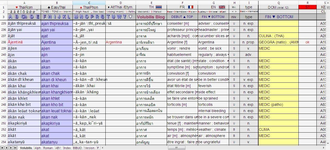 VOLUBILIS - Base de données thai multilingue : Thaï romanisé - Thaï - Français - Anglais - Espagnol - Italien - Néerlandais - Laotien - Malais