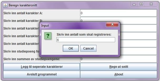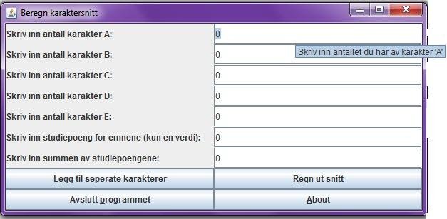 Dette er et prosjekt som ble startet da jeg trengte å regne ut karaktersnitt på høgskolenivå. Programmet er utviklet i Java og regner ut karakterer basert på faste (en karakter, et studiepoeng) og delte karakterer (flere karakterer, et studiepoeng).