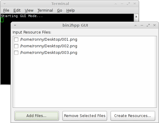 Binary data files will be converted to HEX representation and stored in a 'resource.h' and 'resource.cpp' file