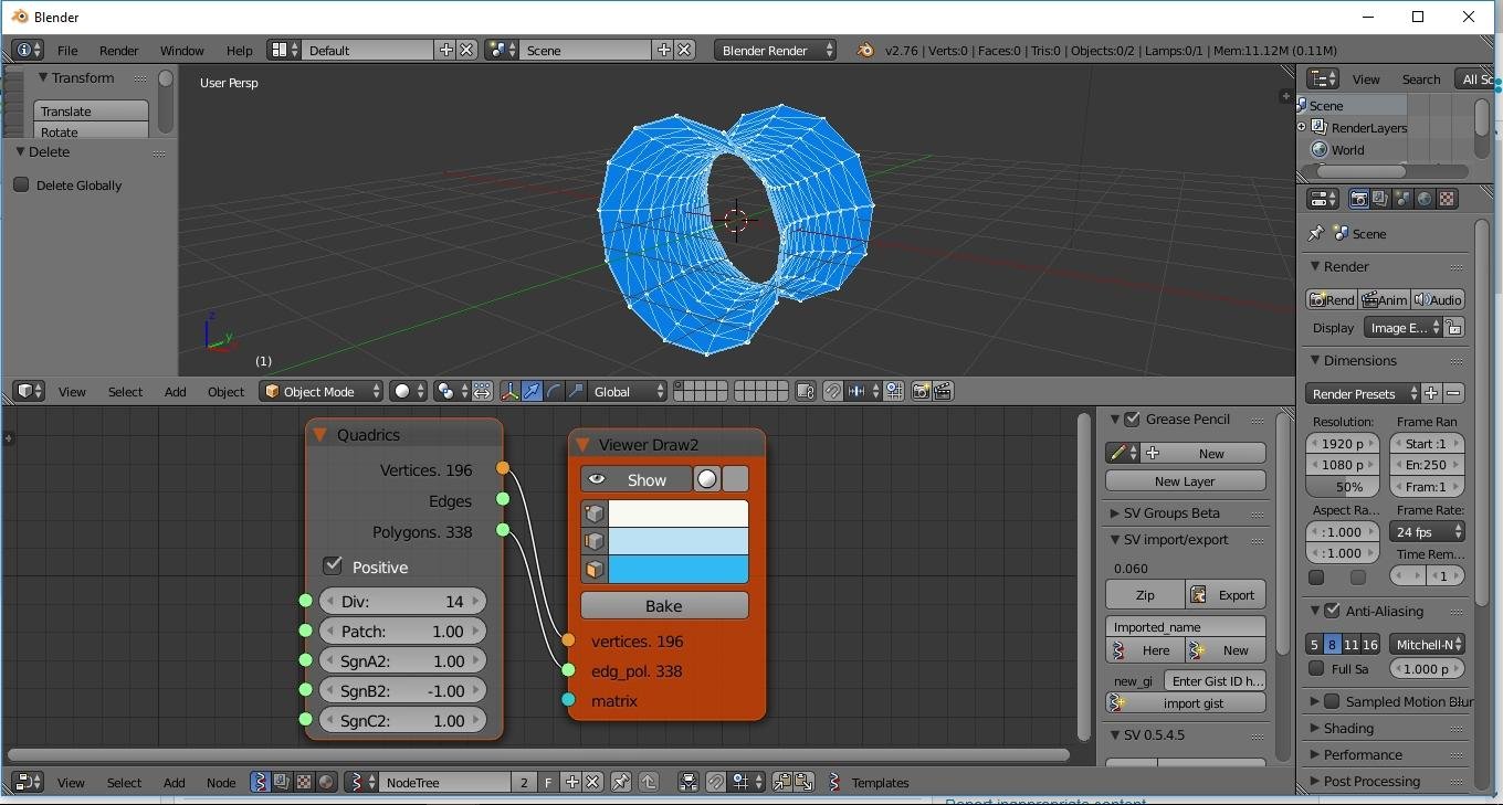 A Blender addon to draw quadrics by the BlendBridge library. The BlendBridge library is a perk in the TWINGSISTER's internal crowdfunding campaign. The Quadrics addon can be used either in Blender or as a node in Sverchok