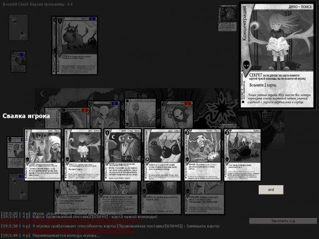 This is a computer client for an original CCG game "Boomb.It!" (see www.shadem.ru). It allows to play the game without an opponent (AI developing), and it is able to play as p2p client over the Internet through the build-in jabber client.