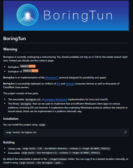 BoringTun is a high-performance, portable implementation of the WireGuard VPN protocol written in Rust, designed so that developers and system integrators can run WireGuard tunnels entirely in user space across a variety of operating systems without kernel modules. It implements the core WireGuard protocol — including key exchange, encryption (ChaCha20-Poly1305), and authenticated transport — while omitting platform-specific tunneling stacks, allowing embedment in custom VPN client applications or userspace networking tools. The repository includes both a library for programmatic use and a command-line executable that can act as a userspace WireGuard interface on supported platforms like Linux and macOS. Because it’s written in Rust, BoringTun benefits from strong safety guarantees, memory safety without garbage collection, and cross-platform support, making it suitable for mobile, desktop, and server environments.
