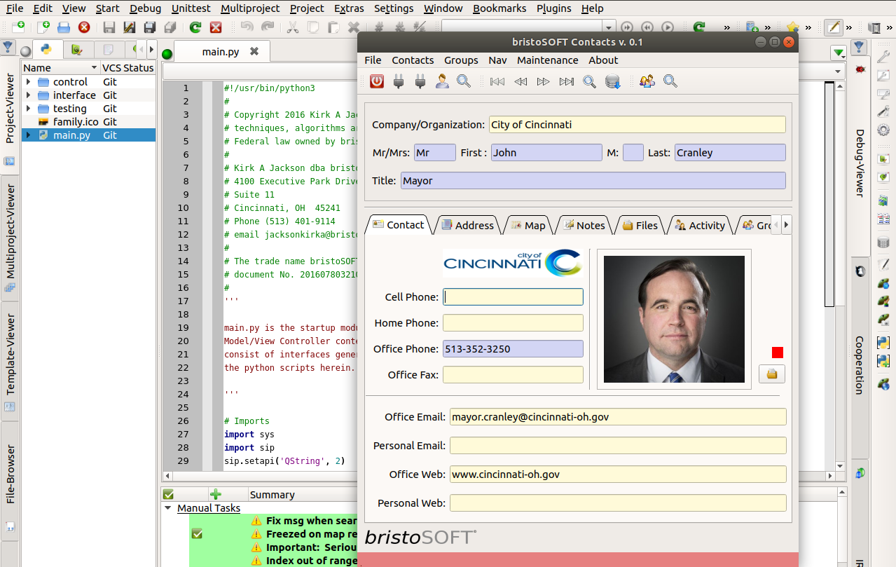 bristoSOFT Contacts is a group oriented contact management software application written in Python, PyQt and PostgreSQL based on MVC software architecture. All contacts include email, telephone, address, title, name, company and also include notes, files, integrated google maps, activities such as phone calls, appointments, messaging, calendar. Contacts is a novel project with cutting edge technology.