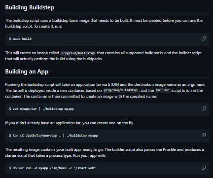 Buildstep is a Docker-based wrapper around Heroku-style Buildpacks. It takes in your app code as a tarball via STDIN, runs the builder script inside a container preloaded with multiple buildpacks, and generates a ready-to-run Docker image, including a generated start script from a Procfile.