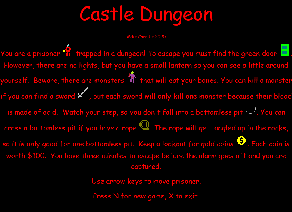When I was in college, I spent a lot of time playing a game called Castle Dungeon on my Commodore 64. This is my version of that game, as close as I can remember after so many years.