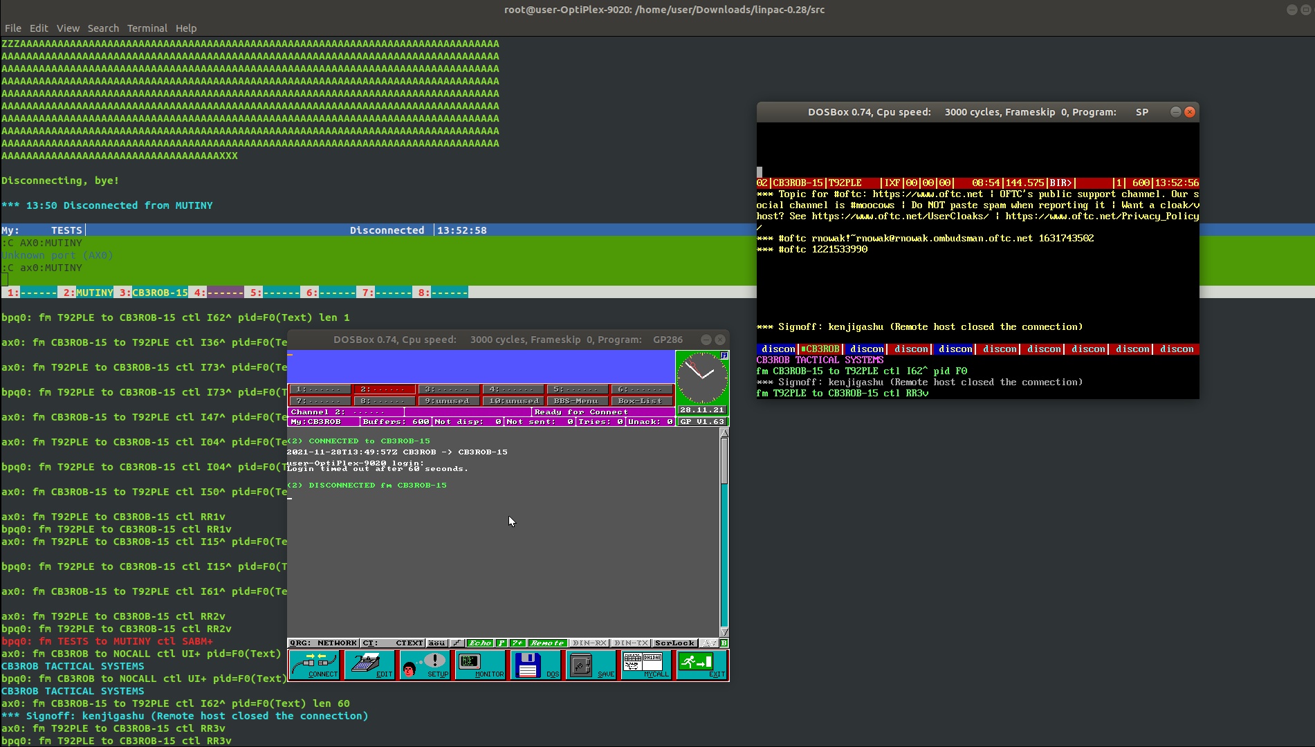 AX.25 protocol (packet radio and APRS) interface / bridging / switching / terminal related software for Linux. Have your bpq ethernet/wifi connected terminals talk to each other or stations on the radios transparantly. connect from home with KISS-TCP. link your remote AX.25 network segments together with KISS-TCP vpns etc. oh and get a linux terminal login over your normal every day packet radio terminal software. all the stuff that was missing from the start. ;P note that we don't use for /etc/ax25/axports -at all- and think it should disappear as it makes no sense to have callsigns and mtu's and stuff on an interface, in a config file, AND in a program. whatever info is needed should just be obtained from the interface. like with any other protocol stack (you also don't have to put your ip address in your webbrowser, a seperate file in /etc, and the interface) (so there is also no need to install those old ax25-tools - just the kernel suffices)