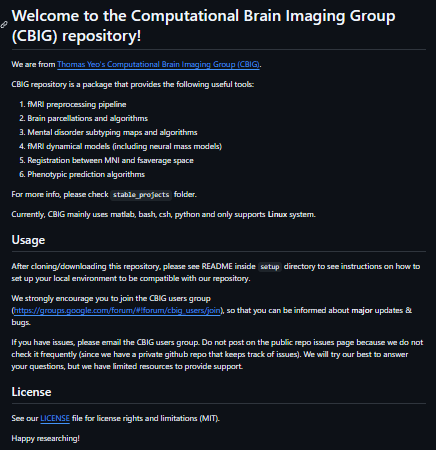CBIG is a comprehensive toolkit maintained by Thomas Yeo’s Computational Brain Imaging Group containing tools for processing and analyzing neuroimaging data—including fMRI preprocessing pipelines, brain parcellation algorithms, mental disorder subtyping models, fMRI dynamic models, registrations between brain spaces, and phenotypic prediction algorithms. After cloning/downloading this repository, please see README inside setup directory to see instructions on how to set up your local environment to be compatible with our repository. Brain parcellation tools (e.g., Yeo networks, Schaefer parcellations) for cortical mapping.