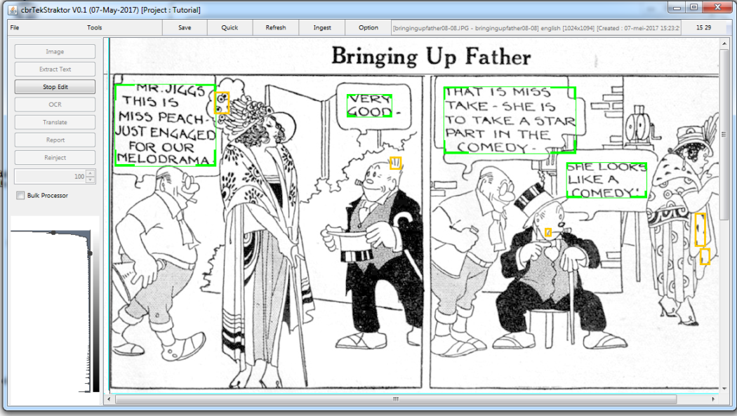 cbrTekStraktor is an application to automatically extract text from the text bubbles or speech balloons present in comic book reader files (CBR). Its prime goal is to perform analysis on the texts of comic books. cbrTekStraktor can however also be used for scanlation or similar purposes.