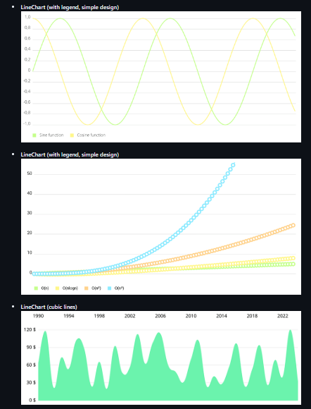 - Supports line, bar, pie, scatter, and radar charts