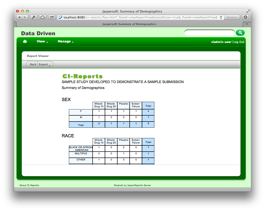 CI-Reports is helpful to generate a report of clinical trial data based CDISC SDTM. CI-Reports also provide the reports as PDF, Excel, Word, Flash, LibreOffice and RTF.