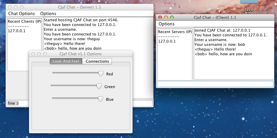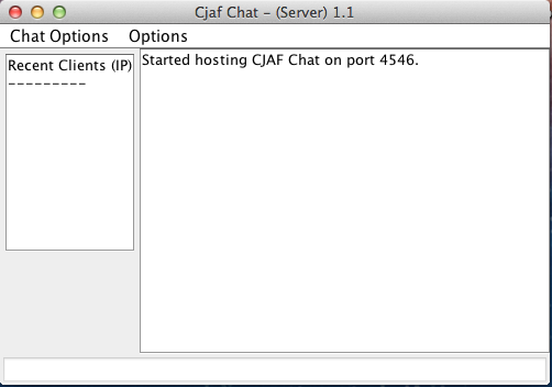 The CJAFServer runs and listens on port 4546 for a client to make a connection. The CJAFClient attempts to connect to the IP that you give it at startup, and if the connection is successful, the Server and client may choose a username and start chatting!