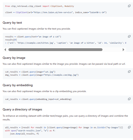 clip-retrieval is an open-source toolkit designed to build large-scale semantic search systems for images and text by leveraging CLIP embeddings to enable multimodal retrieval. It allows developers to compute embeddings for both images and text efficiently and then index them for fast similarity search across massive datasets. The system is optimized for performance and scalability, capable of processing tens or even hundreds of millions of embeddings using GPU acceleration. It includes components for inference, indexing, filtering, and serving results through APIs, making it a complete pipeline for building production-ready retrieval systems. The framework also supports querying by image, text, or embedding, enabling flexible use cases such as reverse image search or multimodal content discovery. Additionally, it provides a simple frontend interface and backend services that can be deployed to expose search functionality to users.