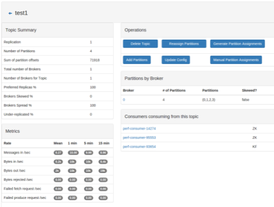 CMAK (previously known as Kafka Manager) is a tool for managing Apache Kafka clusters. Easy inspection of cluster state (topics, consumers, offsets, brokers, replica distribution, partition distribution). Generate partition assignments with option to select brokers to use. Run reassignment of partition (based on generated assignments). Create a topic with optional topic configs (0.8.1.1 has different configs than 0.8.2+). Delete topic (only supported on 0.8.2+ and remember set delete.topic.enable=true in broker config). Topic list now indicates topics marked for deletion (only supported on 0.8.2+). Batch generate partition assignments for multiple topics with option to select brokers to use. Optionally enable JMX polling for broker level and topic level metrics. Optionally filter out consumers that do not have ids/ owners/ & offsets/ directories in zookeeper.