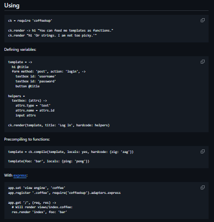 CoffeeKup is a concise templating engine written in CoffeeScript that aims to provide an expressive, readable way to generate HTML from templates inside Node.js applications. It emphasizes minimal, CoffeeScript-style syntax so template authors can write small, elegant templates that integrate naturally with CoffeeScript codebases. The engine supports common templating needs—embedding variables, simple control flow, partials/includes, and basic layout patterns—while focusing on clean, compact syntax rather than a huge feature surface. Because it targets CoffeeScript users, CoffeeKup often appeals to projects that prefer that language’s terse style and want templates that look like the rest of their code. The project includes examples and installation instructions for integrating templates into server-side rendering pipelines and simple static site workflows.