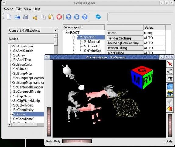 Coindesigner is a RAD environment to build 3D scenes based in openInventor, just using drag&drop and updating changes on the fly. An external multi platform viewer allows to distribute the scene without need of the RAD.