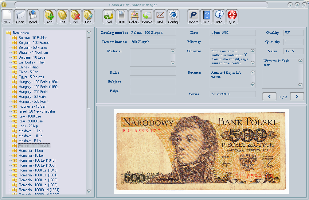 Coins & Banknotes Manager was developed as a tool that help numismatic collectors to manager their collections fast and easy. As a collector is very important to keep updated every item from your collection. This tools also have options to export items data in a various formats, like photo gallery, HTML pages with items informations and many more.