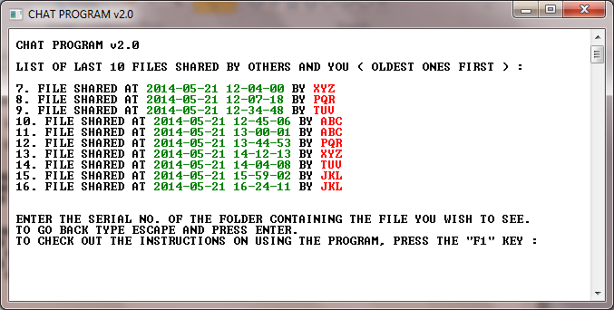 This is a simple console-based LAN chat program that must be accessed in a common network folder ( please make sure this folder is empty ) by all the users. It is a basic program and can be used for simple chats between LAN connected computer systems but has features to enable you to share links and files too.