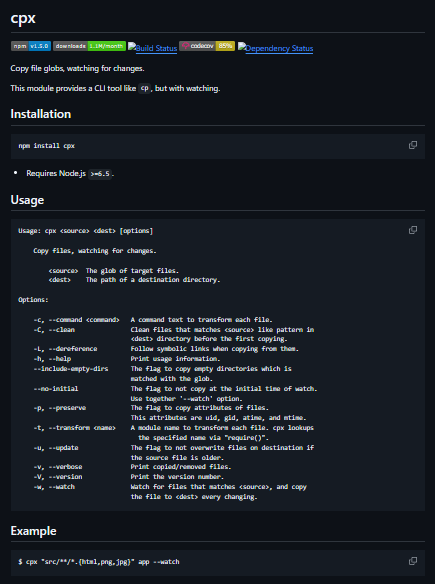 CPX is a Node.js file copying utility designed for handling complex file copy operations with watch mode support. It is useful for build pipelines that require file synchronization.