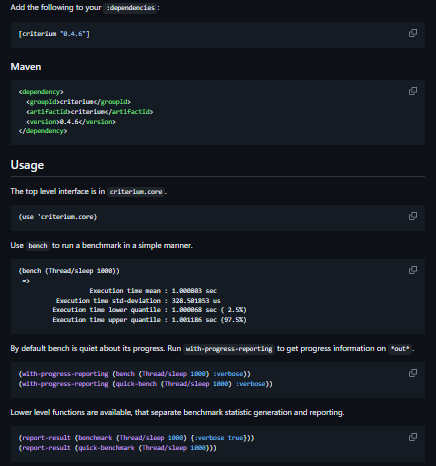 Criterium is a robust benchmarking library for Clojure that addresses common statistical and JIT-related issues. It provides accurate timings through warm-up, garbage collection control, and statistical summaries—making microbenchmarking more reliable than using time. Statistical processing of multiple evaluations. Inclusion of a warm-up period, designed to allow the JIT compiler to optimise its code. Purging of gc before testing, to isolate timings from GC state prior to testing. A final forced GC after testing to estimate impact of cleanup on the timing results.
