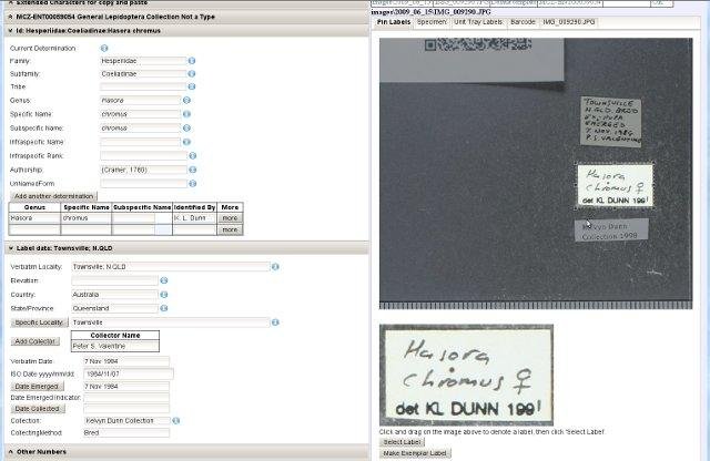 Applications to support the efficient capture of data from natural science collections specimens (particularly entomological collections), by facilitating pre-capture of data reflecting the storage structure of the collection, imaging of the specimens to separate data capture from specimen handling, and community sourcing transcription of hand written label data. Designed and written by a team at the Museum of Comparative Zoology. Includes a PreCapture barcode application refactored from this code base with support from the US National Science Foundation ADBC TCN for New England Vascular Plants NSF #1208835