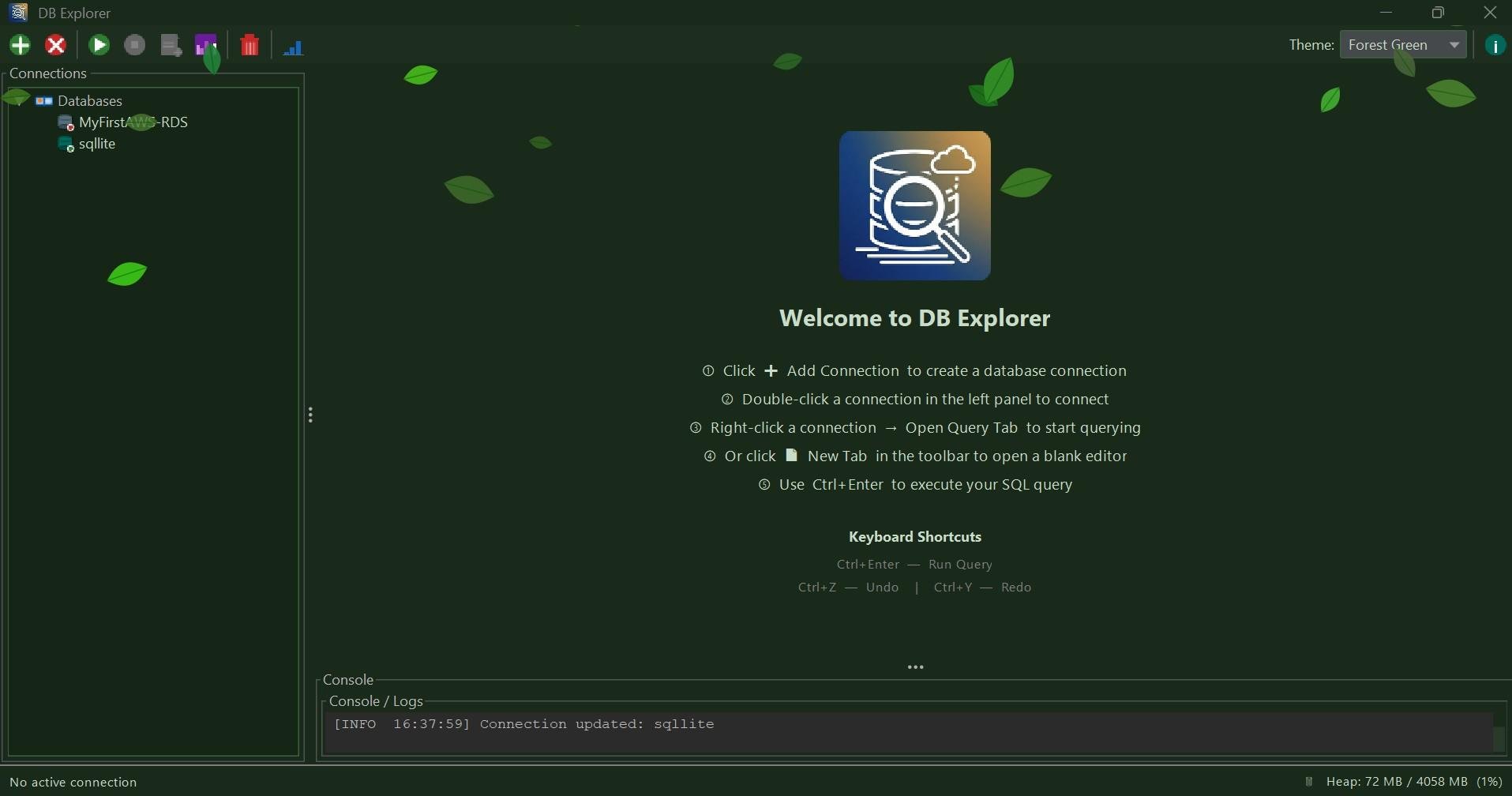 DB Explorer is a powerful, cross-platform Java-based database query tool and explorer designed for developers, DBAs, and data analysts. It provides an intuitive GUI for connecting to multiple databases including PostgreSQL, MySQL, SQL Server, Oracle, SQLite and Dynamo DB along with support of connection any of database via Generic JDBC driver.