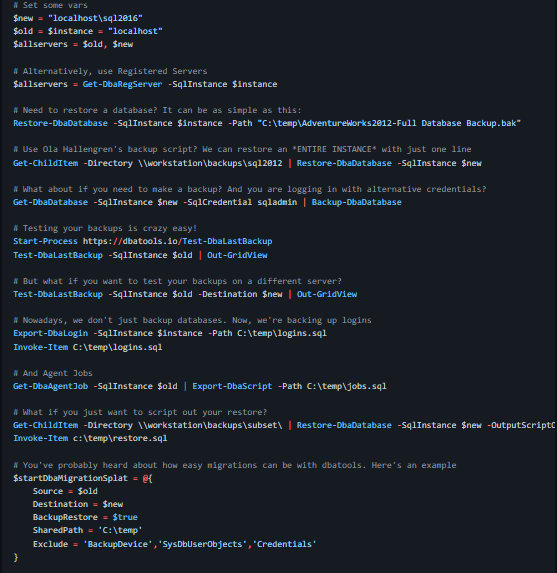 Instance migrations and best practice implementations have never been safer, faster or freer. dbatools is PowerShell module that you may think of like a command-line SQL Server Management Studio. The project initially started out as just Start-SqlMigration.ps1, but has now grown into a collection of over 500 commands that help automate SQL Server tasks and encourage best practices. dbatools now works on PowerShell Core (aka PowerShell 6+). This means that you can run a large majority of our commands on Linux and macOS. In addition to the simple things you can do in SSMS (e.g. starting a job, backing up a database), we've also read a whole bunch of docs and came up with commands that do nifty things quickly. By default, all SQL-based commands will login to SQL Server using Trusted/Windows Authentication.