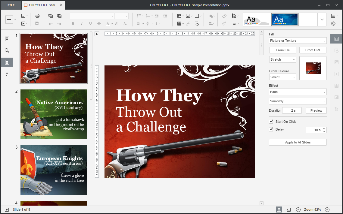 The editors offer 100% compatibility with MS Office and support other popular document formats including OpenDocument. The application also allows connecting third-party plugins, making it easy for developers to write their own extensions and add new features to the editors.