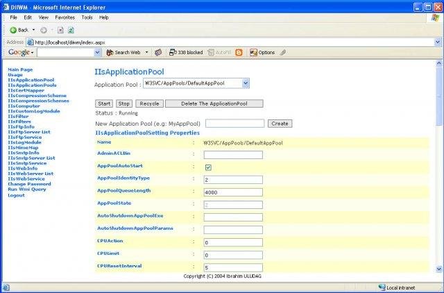 DiIWM (Di IIs Web Manager) is a web application written in VB.NET to manage IIS6.0. Both WMI and ADSI is used. DiIWM can connect and manage local and remote IIS. DiIWM also provides an assembly (Di) written in C# to manage IIS6.0.