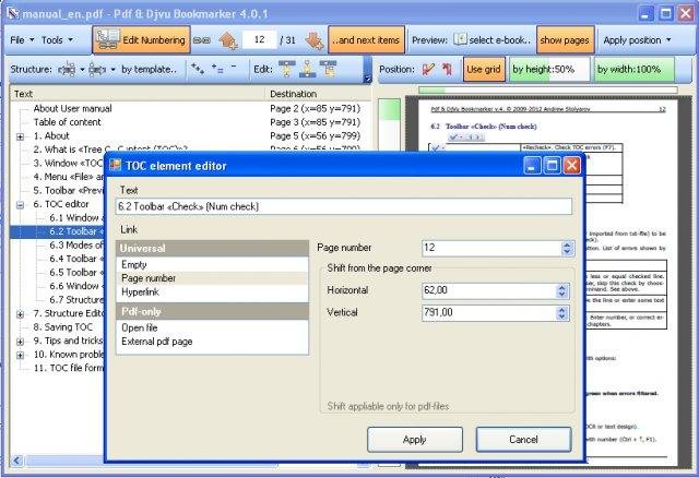 Pdf & Djvu Bookmarker is a powerful tool to create and edit outlines in Pdf and DjVu files. It is based on DjVuLibre, iTextSharp and TreeViewAdv for .NET. Adobe Reader X should be installed on target computer. For more info read MediaWiki on Hosted Apps page and manuals (included in installation).