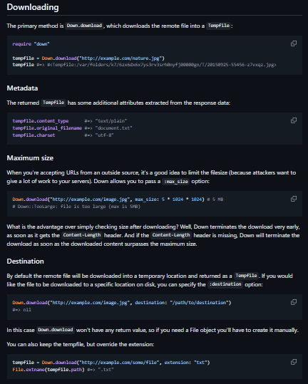 Down is a small, reliable Ruby library for downloading files that favors correctness, streaming, and clear error handling. It follows redirects safely, supports timeouts and retries, and streams responses to disk to keep memory usage low—ideal for large downloads or server environments. The API returns file-like objects (often Tempfile) with helpful metadata such as original filename and content type, which plays nicely with file-attachment libraries and background jobs. Multiple HTTP backends are supported, letting you choose between Net::HTTP or faster/feature-rich clients while keeping a consistent interface. It exposes distinct exception classes and content validation options, so callers can differentiate transient network issues from invalid responses. In practice, Down is often used as the dependable download layer in upload/processing pipelines where robustness matters more than raw feature bloat.