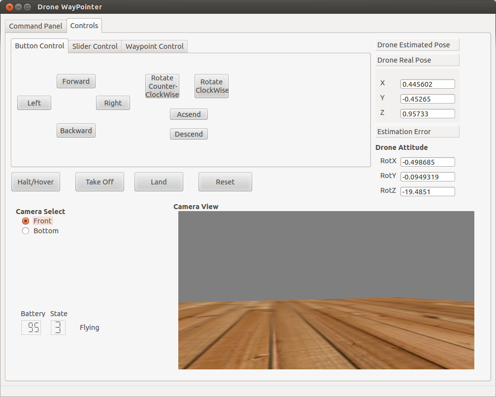 "Drone WayPointer" is a ROS package that provides a UI to allow for remote control of the Parrot AR Drone 2.0. It is developed in C++ with qt-ros and the Qt4 Development FrameWork. It is designed to work with the ROS - Fuerte and it uses the the ardrone_autonomy driver (Fuerte-devel Branch). It has so far only been tested on the tum_simulator and not on the actual drone. The main functionalities it provides is camera streams of front or bottom cameras of the drone, button and slider control of the drone XYZ velocities, control using waypoints and waypoint commands, pose estimation using simple dead-reckoning and measurement and image recording functionalities.
