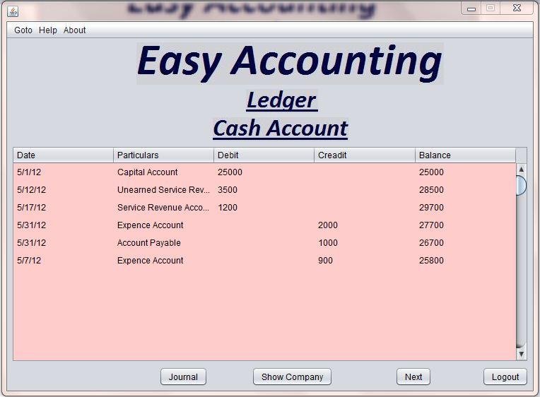 Easy Accounting is an platform independent(works in any operating system like Windows/Linux/Unix/Mac/Solaries) educational software by which one can generate journal and ledger for multiple companies or users by input the transactions .