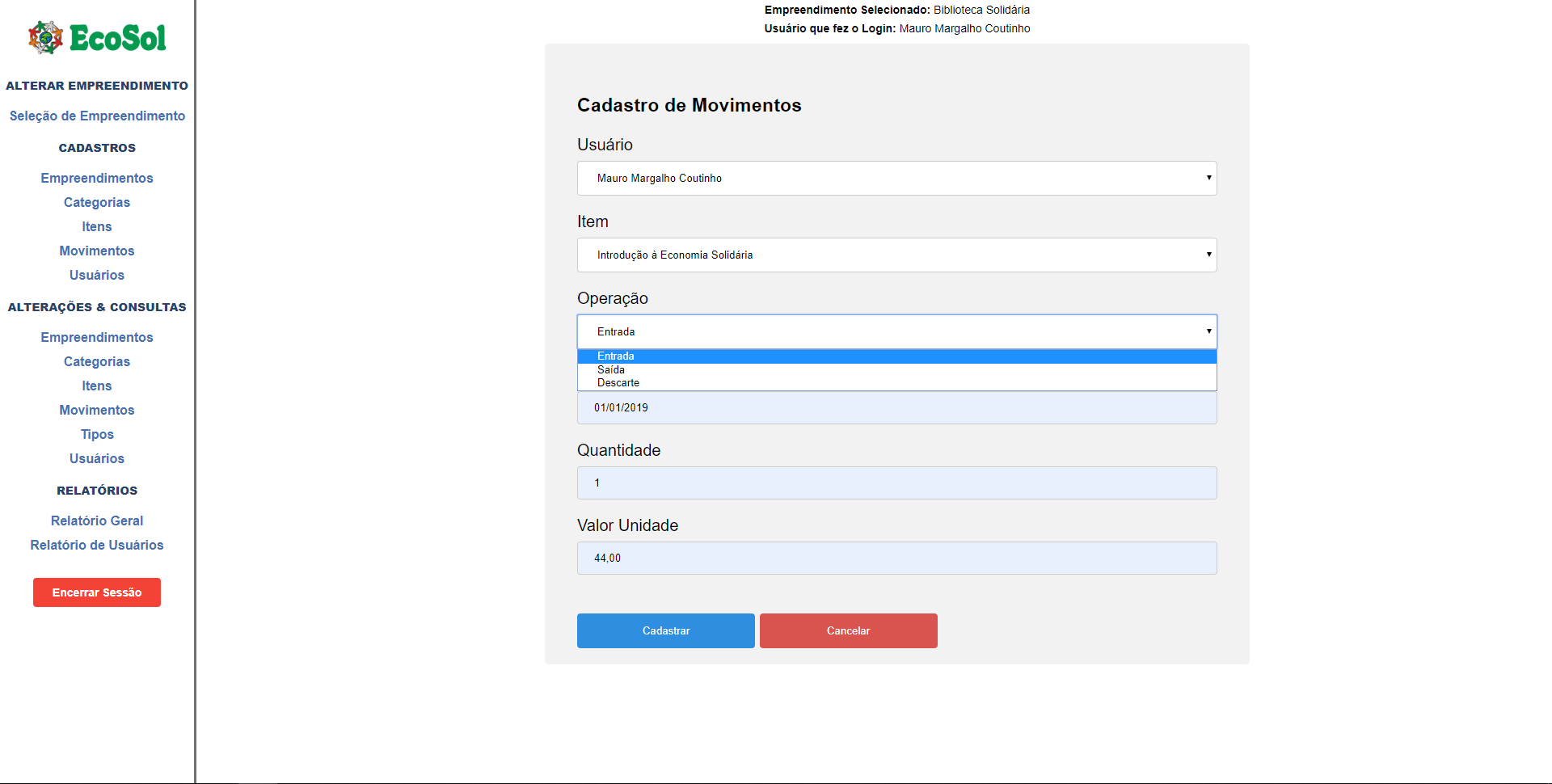 EcoSol é um sistema base para empreendimentos de economia solidária. O sistema é composto por um módulo administrativo, que é executado no servidor, e um módulo Web. O módulo administrativo fornece a interface para o gerenciamento e consulta de empreendimentos, movimentações, itens e usuários. O módulo Web é um aplicativo mobile que permite aos usuários consultarem seus históricos de movimentação, assim como os itens disponíveis para troca. Projeto de iniciação científica financiado pela CAPES e pelo CNPq, sob a orientação do Prof. Dr. Mauro Margalho Coutinho.