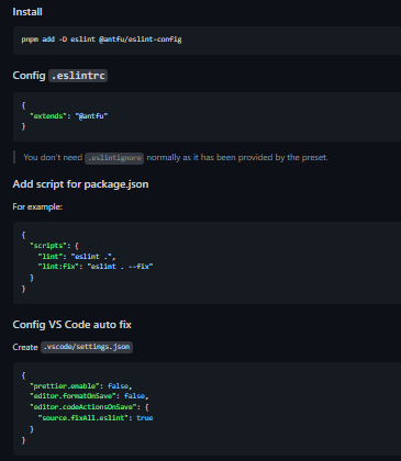 Anthony's ESLint config presets. Auto fix for formatting (aimed to be used standalone without Prettier). Designed to work with TypeScript, Vue out-of-box. Lint also for json, yaml, markdown. Sorted imports, dangling commas for cleaner commit diff. Reasonable defaults, best practices, only one-line of config.