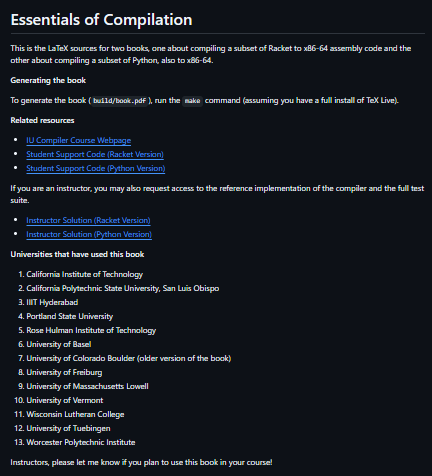 LaTeX source for two companion books—one compiling a subset of Racket, the other a subset of Python—both targeting x86‑64 assembly, used in Indiana University’s compiler course and published by MIT Press.