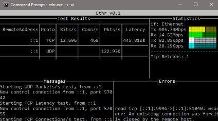 Ethr is a cross-platform network performance measurement tool written in golang. The goal of this project is to provide a native tool for comprehensive network performance measurements of bandwidth, connections/s, packets/s, latency, loss & jitter, across multiple protocols such as TCP, UDP, HTTP, HTTPS, and across multiple platforms such as Windows, Linux and other Unix systems. Ethr takes inspiration from existing open-source network performance tools and builds upon those ideas. For Bandwidth measurement, it is similar to iPerf3, for TCP & UDP traffic. iPerf3 has many more options for doing such as throttled testing, richer feature set, while Ethr has support for multiple threads, which allows it to scale to 1024 or even higher number of connections, multiple clients communication to a single server etc. For latency measurements, it is similar to latte on Windows or sockperf on Linux.