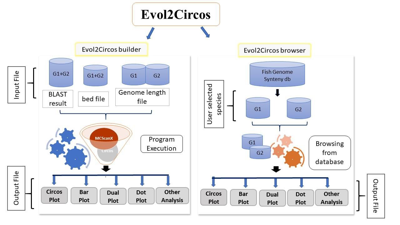 Evol2Circos provide a tool based user-friendly platform to analyse user specific data for synteny construction and visualization, and a web based platform to facilitate the browsing of the syntenic information of different fish species using Circos plot, bar, dual and dot plot. The information generated from Evol2Circos can also be used for further downstream analysis.